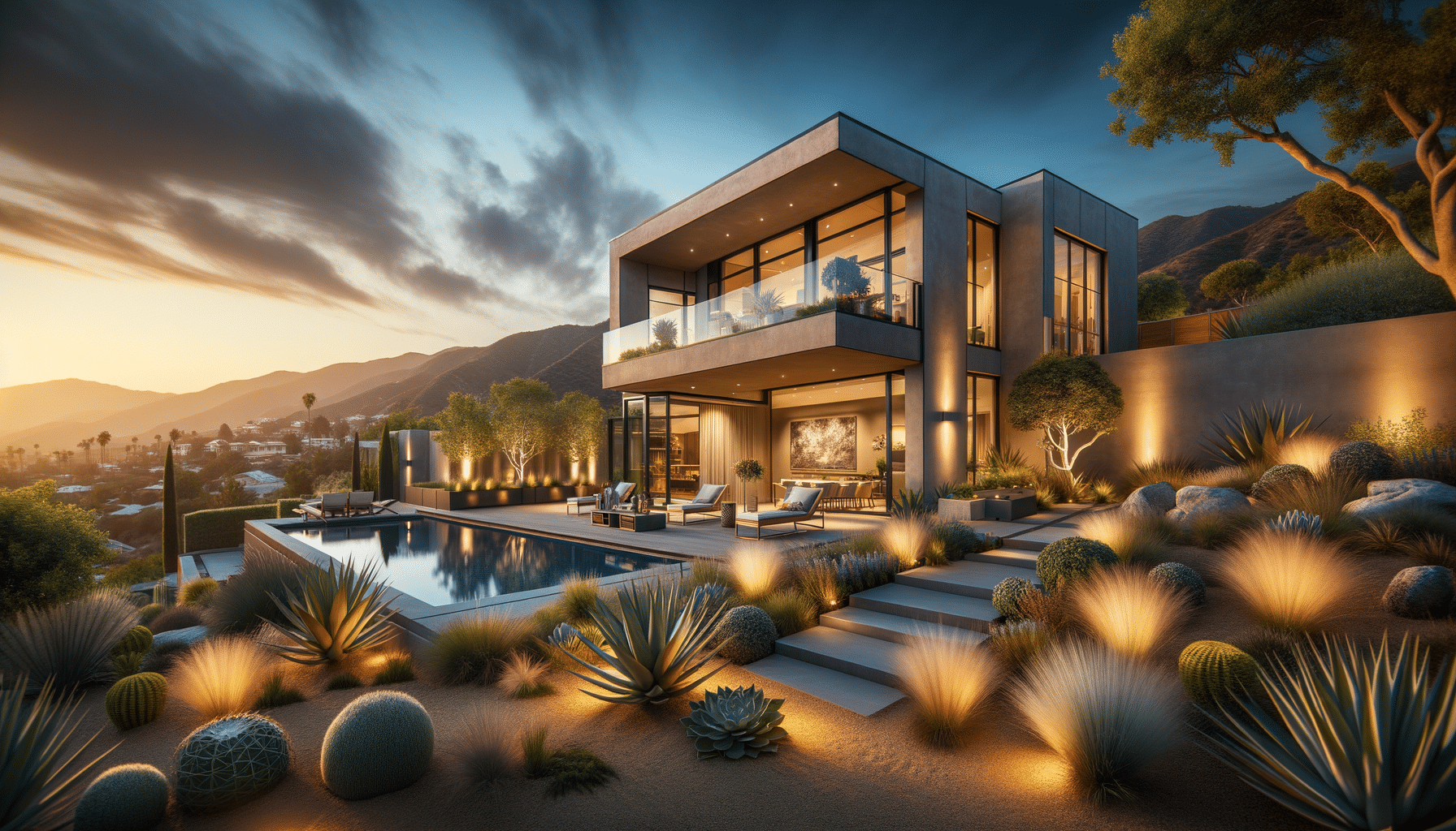 - Enfatiza el flujo interior-exterior con patios estilizados, terrazas con vistas y muebles de piscina para casas en las colinas de Porter Ranch.